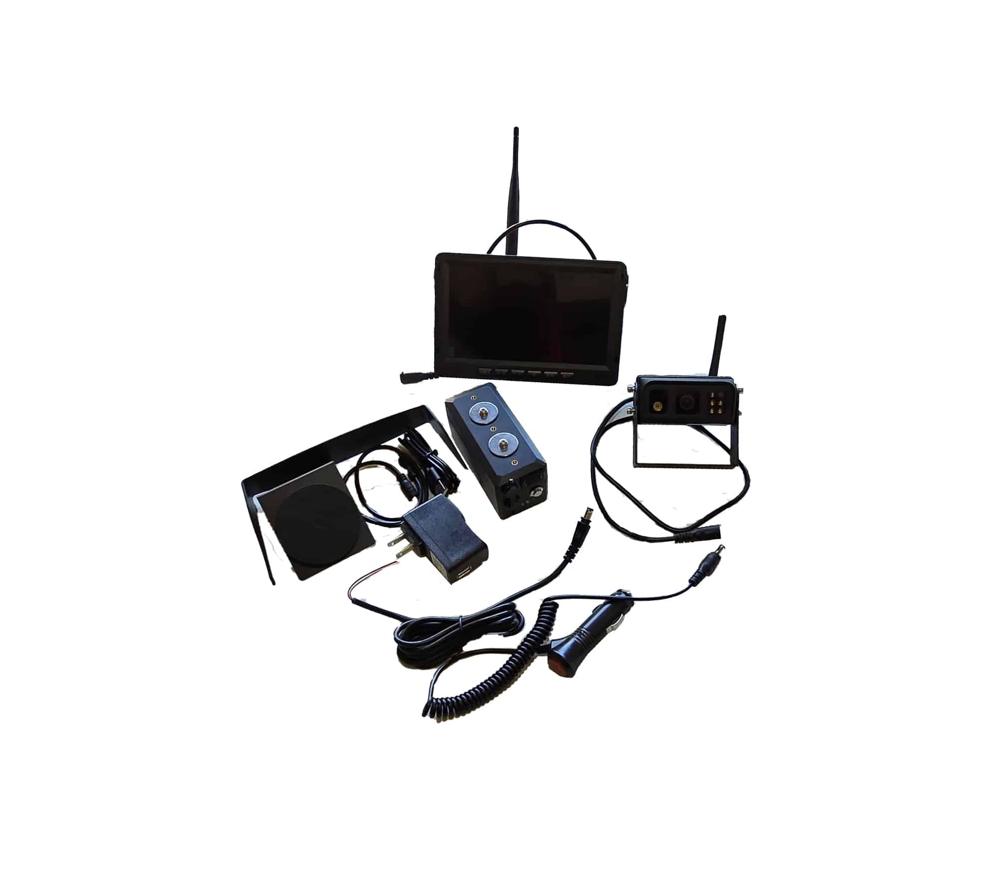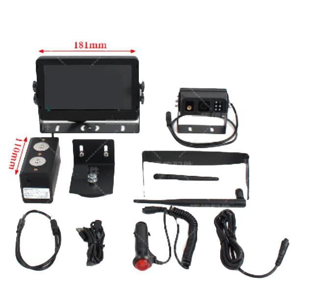 The Kit come with 7-inch 706 HD display (12-30V/not waterproof) + infrared laser forklift camera (black/12V/waterproof grade IP67); camera bracket with magnet, with laser positioning
